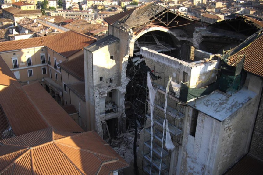 Il gravissimo stato di degrado in cui versano diverse aree del monumento – degrado accentuato dall’esposizione diretta agli agenti atmosferici, che ha determinato la perdita di molti apparati decorativi- richiede l’esecuzione di rilevanti interventi strutturali, con ricostruzione di ampi brani murari, in modo da consentire la piena, completa reintegrazione delle grandi lacune aperte dal sisma nel corpo dell’originaria struttura.